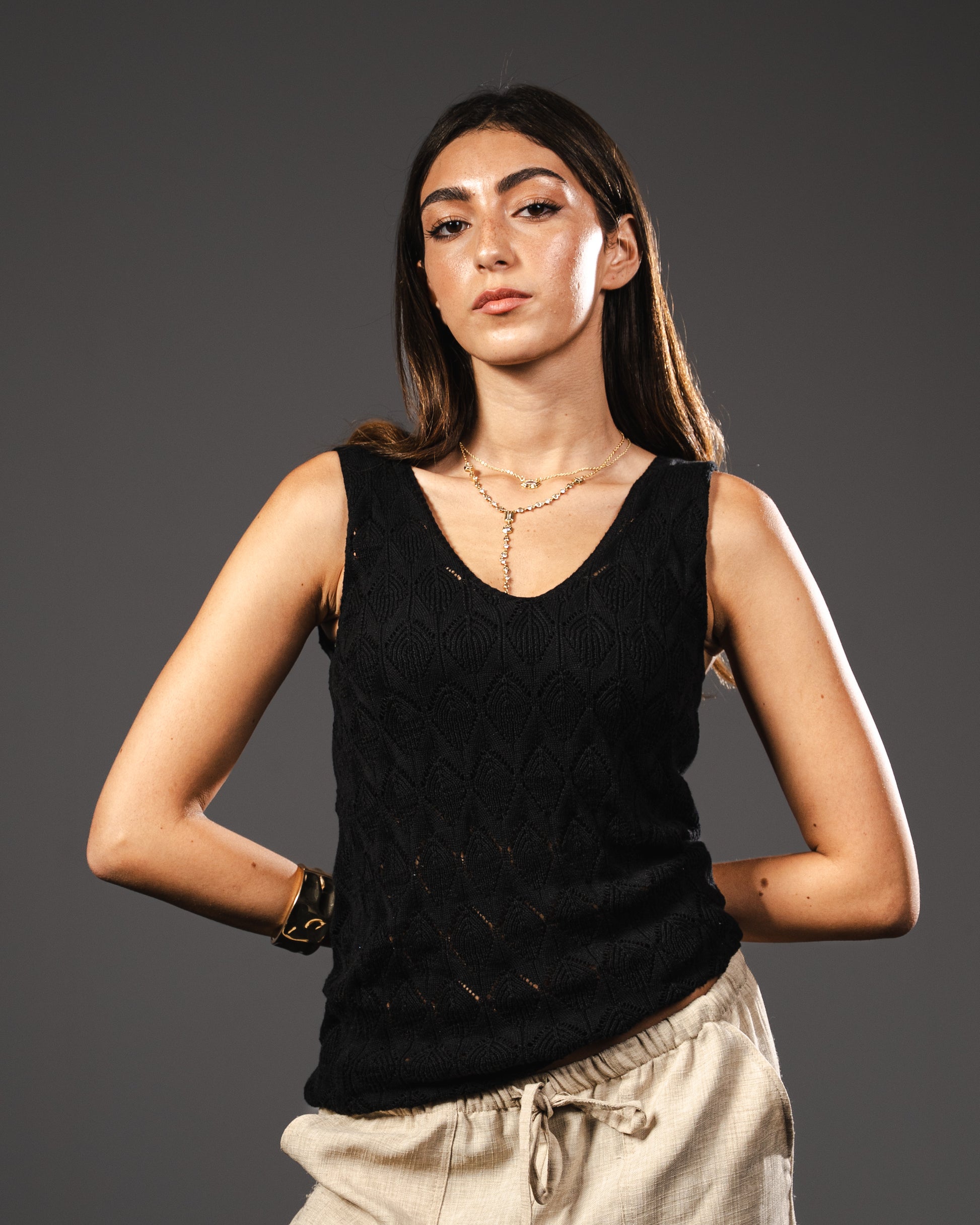 A crisp black shell top designed in a versatile one sized fit offering effortless elegance and comfort for a range of body shapes.